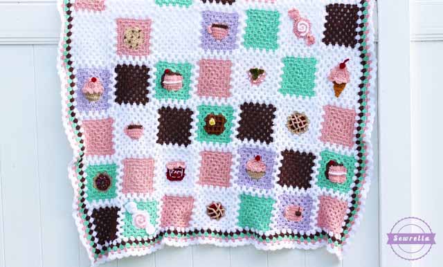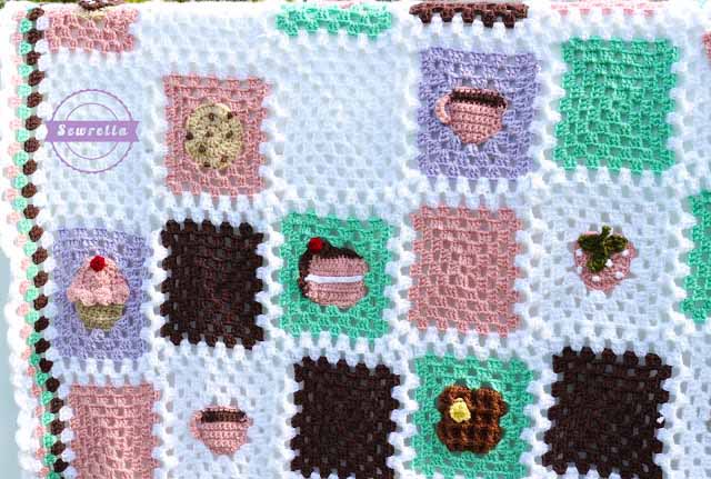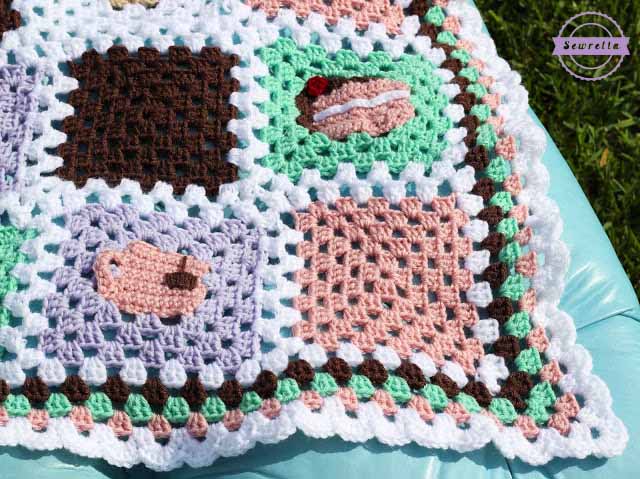 I decided on a simple granny stitch border with a scalloped edge – something simple and classic to let those bake shop motifs really shine.